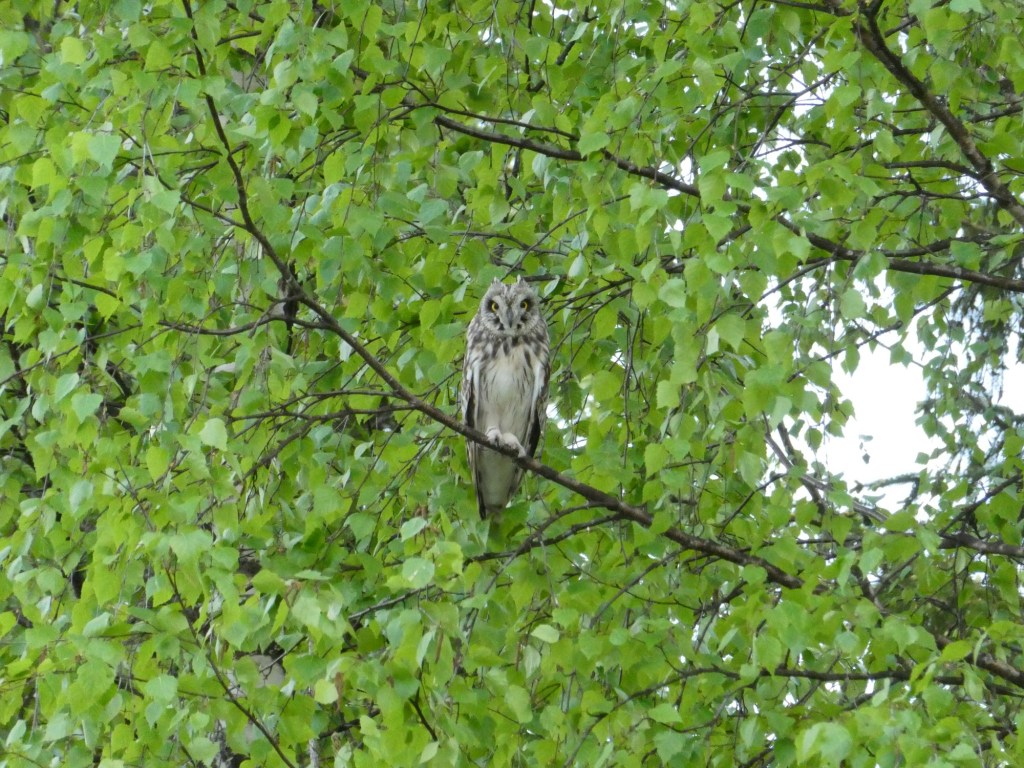 Zwischen den ganzen Seen erstrecken sich die meiste Zeit weitläufige Birken-, Kiefern- und Fichtenwälder – teils ziemlich sumpfig und manchmal geht es auch durch Moore. Passend dazu, hatten wir wieder einmal eine coole Eulensichtung am Waldrand: eine Sumpfohreule, die sich direkt vor uns in einen Baum gesetzt hat.