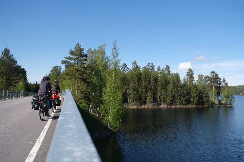 In den nächsten Tagen ging es mitten durch unendlich viele, große und ziemlich schöne Seen. Eigentlich hatten wir gedacht, dass Finnland überwiegend flach ist. Doch schnell haben wir festgestellt, dass genau das Gegenteil der Fall ist. Das ist zwar auf der einen Seite anstrengend, macht die Seenplatte andererseits aber sehr abwechslungsreich – oft folgt nach einem Hügel oder einer Kurve ein erstauntes „Wooow“, wenn der nächste See auftaucht 😀 Insgesamt gibt es in der Region der Finnischen Seenplatte rund 42.000 Seen – in ganz Finnland sogar fast 190.000!
